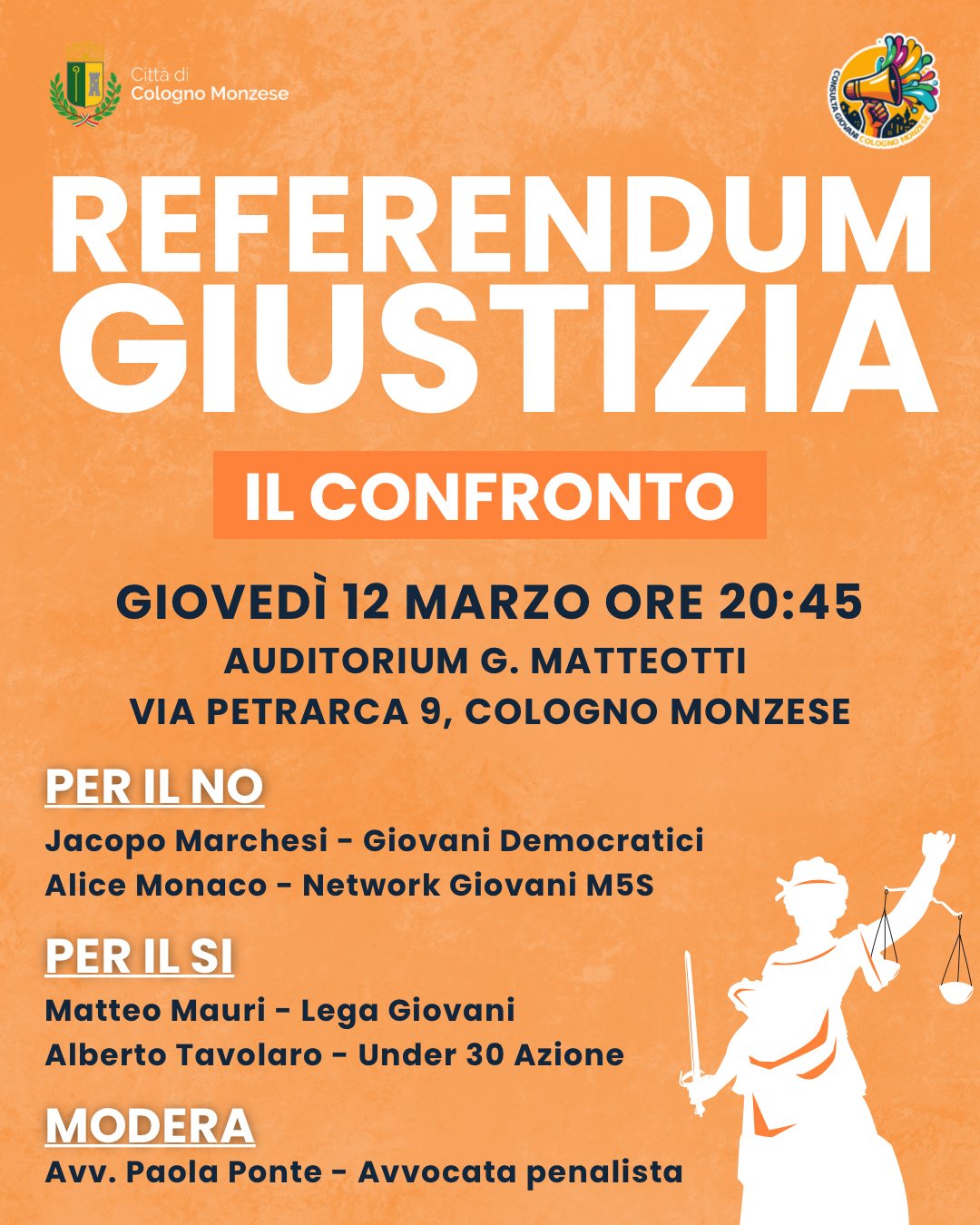 In vista del Referendum confermativo sulla giustizia, previsto per i giorni 22 e 23 marzo 2026, risulta di particolare rilevanza istituzionale favorire occasioni di informazione e confronto pubblico volte a promuovere una partecipazione consapevole al voto.